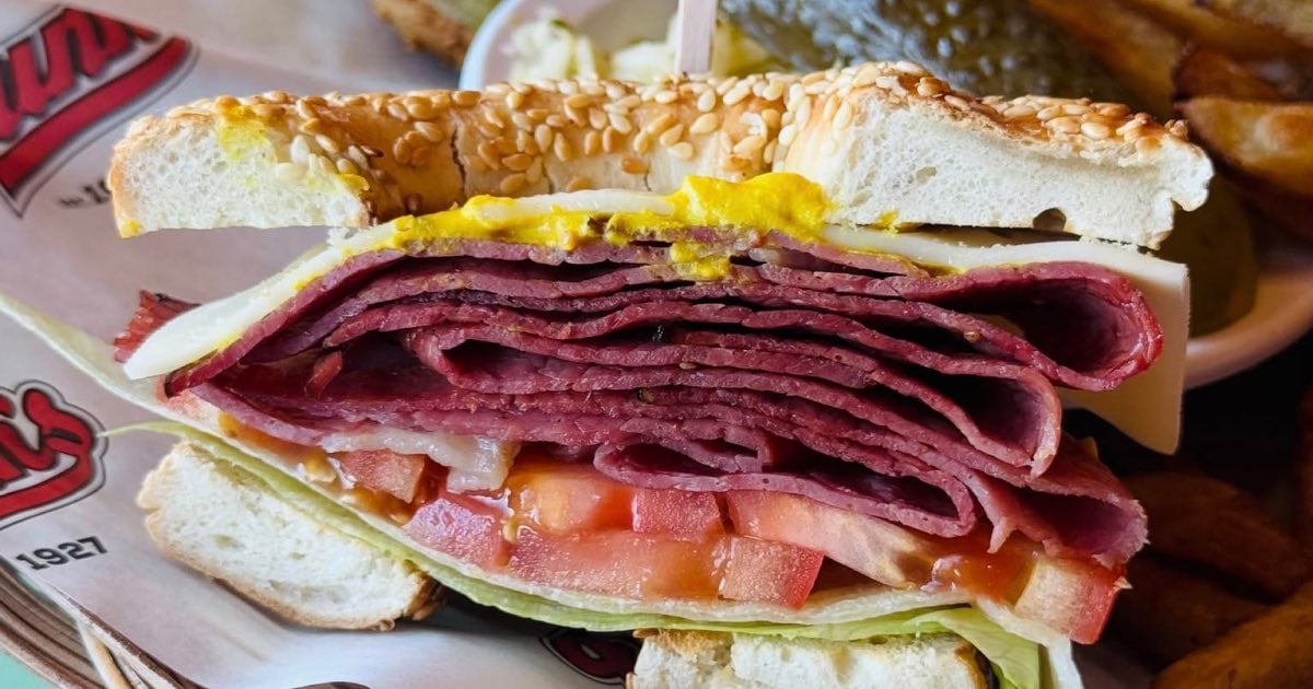 This sandwich swaps the traditional rye bread for a Montreal-style bagel, which is boiled in honey water before baking. The change in the base significantly alters the eating experience.